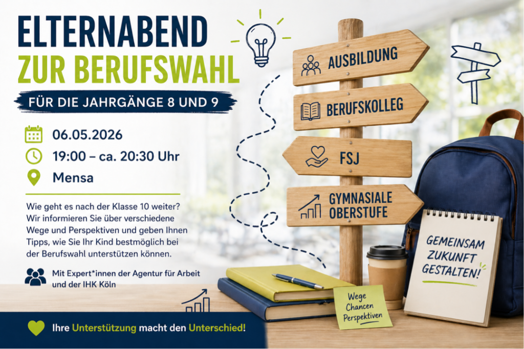 Zu diesen Fragen laden wir alle Eltern und Erziehungsberechtigte der Jahrgänge 8 und 9 herzlich zu einem Informationsabend ein: