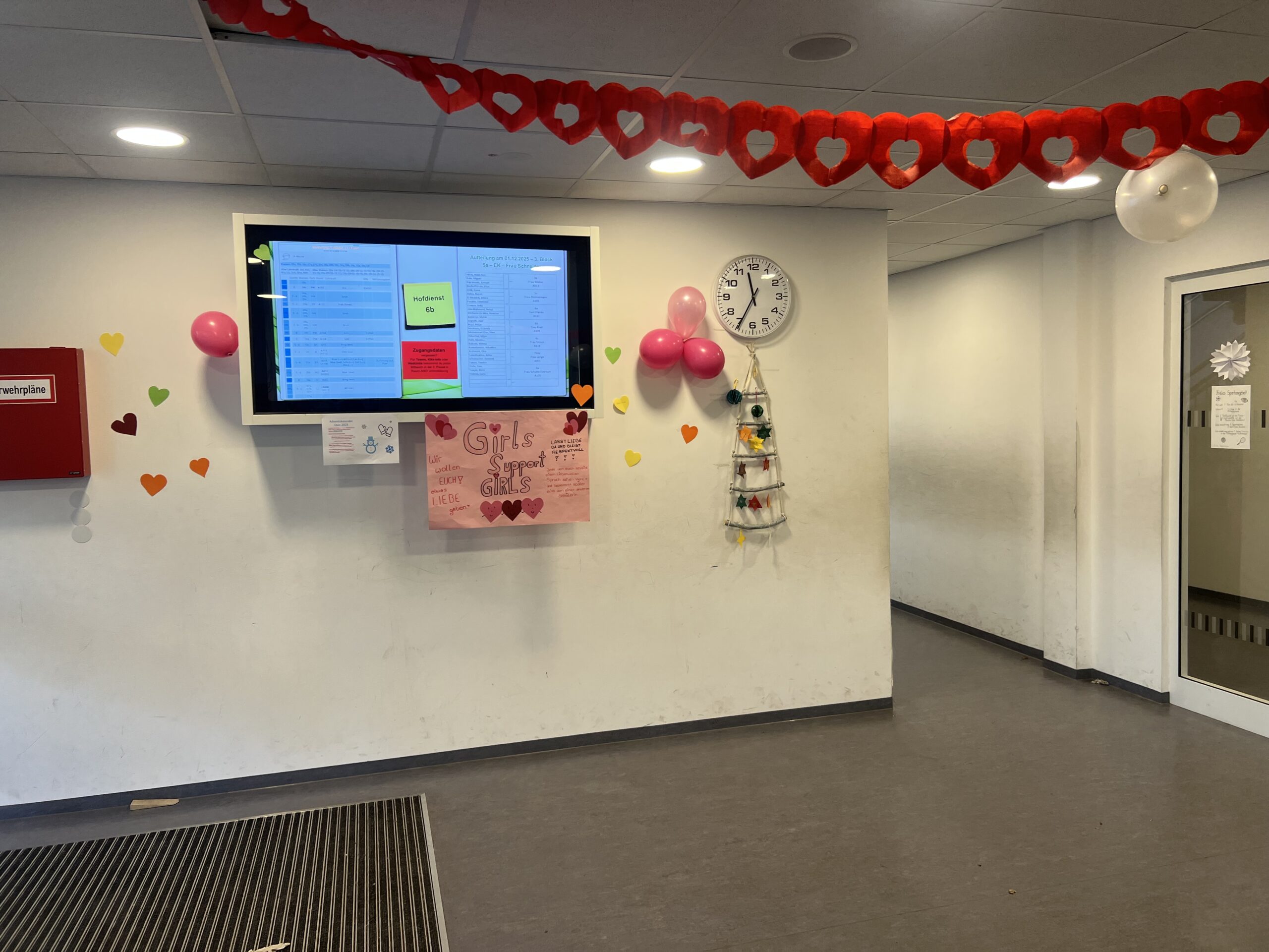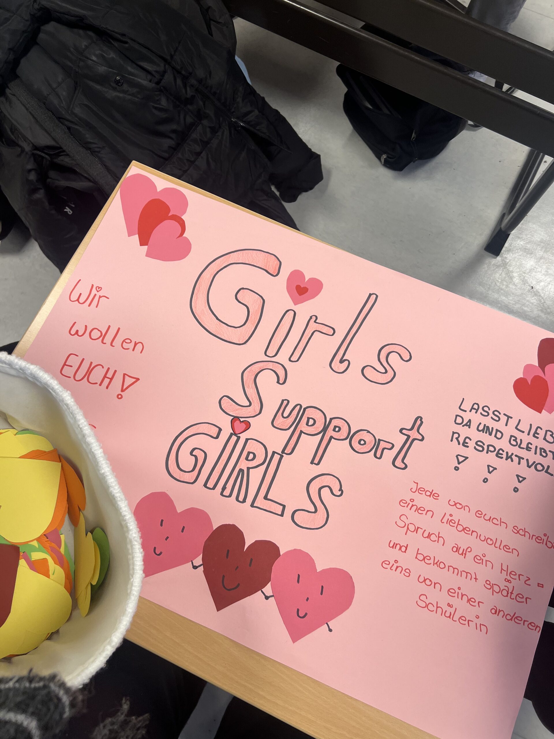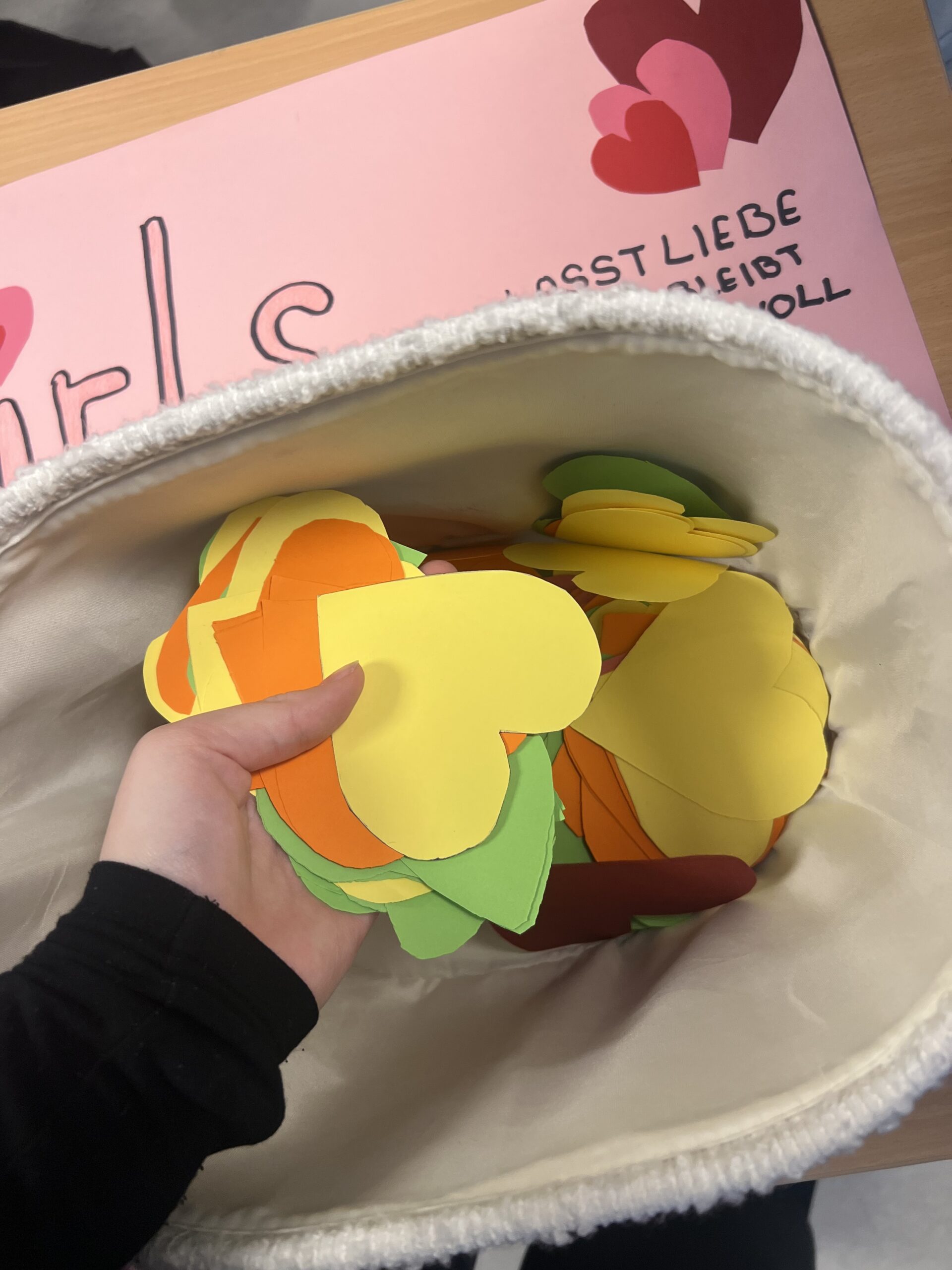 Am 1.12.2025 haben sich die Schülerinnen und Schüler der „Schule ohne Rassismus – Schule mit Courage“-AG eine Aktion zum Girls Support Girls Day überlegt. Sie sind mit einer Box voller Herzen durch die Klassenräume gegangen und haben jeder Schülerin ein Herz gegeben. Anschließend sollten die Schülerinnen eine nette Nachricht darauf schreiben. Jede Schülerin bekam dann ein Herz zurück, auf dem eine liebe Botschaft stand. Das Ziel der Aktion war es, den Zusammenhalt der Mädchen an unserer Schule zu stärken. Es haben mitgemacht: Yasmine O (9a), Elif Y (9a), Naida J (9a), Malak J(9a), Tarik G (9a), Rea R(9b), Rebend Y (9c), Salvatore B (9c), Lorin A (9c), Dana A (9c)