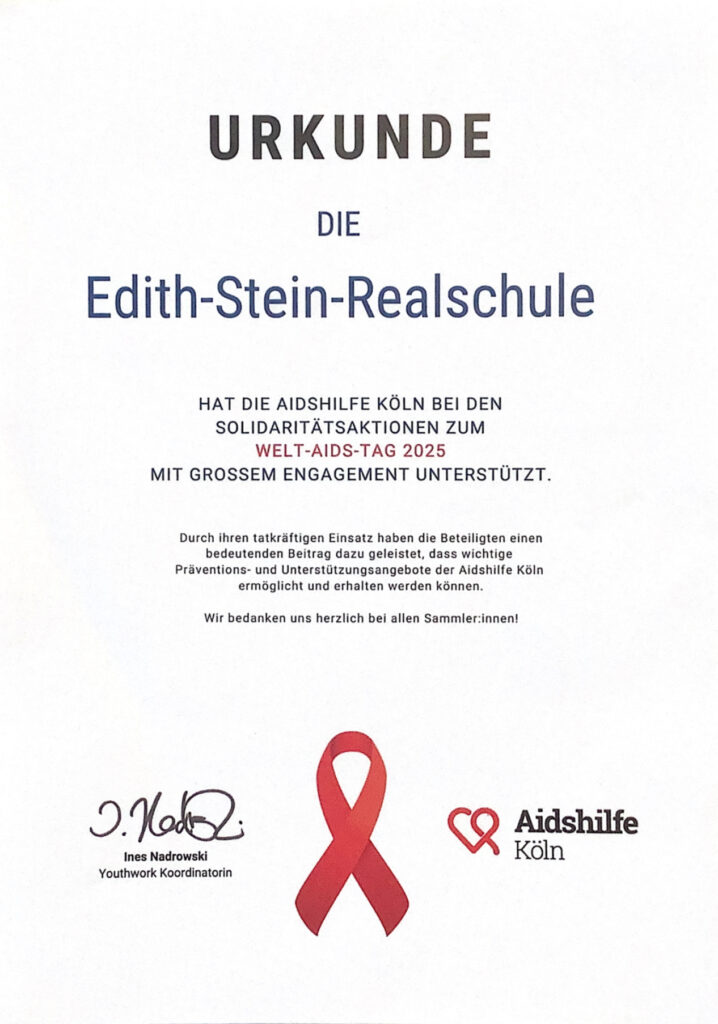 Die 8er und 9er Diff-Bio-Kurse haben sich beim Weltaidstag engagiert. Sie sind zur Aidshilfe Köln mit der Bahn hingefahren, konnten sich dort informieren und haben dort Spiele gespielt. Außerdem gab es Essen und Trinken für die Schülerinnen und Schüler.